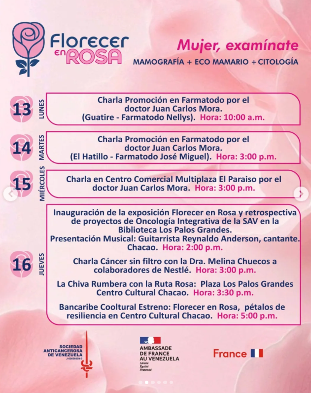 La campaña del Mes Rosa incluye una serie de actividades para sensibilizar a la población. Entre ellas, destaca una actividad artística protagonizada por 14 sobrevivientes de cáncer de mama, quienes compartirán sus experiencias en diversas locaciones de Caracas, transmitiendo un mensaje de esperanza a través del arte.