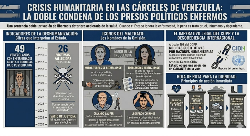 El documento titulado “Crisis humanitaria en las cárceles de Venezuela: la doble condena de los presos políticos enfermos” califica la situación como un trato “cruel, inhumano y degradante” que viola tanto la normativa nacional como los estándares internacionales de derechos humanos.