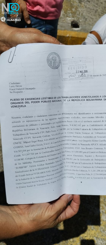 El 27demarzo dirigentes sindicales de distintos sectores laborales se concentraron frente al Ministerio Público en Caracas. Denunciaron las distintas agresiones que vivieron en las protestas de la semana donde exigian su derecho constitucional.