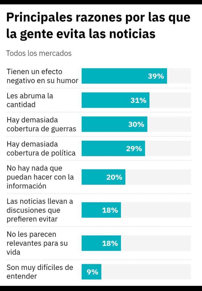 En conjunto, un 60% de los encuestados menciona razones vinculadas al exceso de cobertura, y un 44% específicamente a la saturación de temas políticos y bélicos. Otras razones incluyen evitar discusiones (25%), sentir que la información no es útil (20%), no entender las noticias (7%) o no considerarlas relevantes (16%).