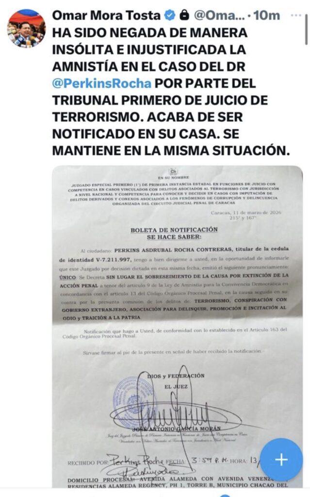 El abogado, Omar Mora Tosta informó que a Perkins Rocha, político y miembro del partido Vente Venezuela le fue negada la solicitud de sobreseimiento de su caso en el marco de la Ley de Amnistía. En el documento se declara la solicitud “sin lugar”. Es decir, se mantiene en curso el proceso en su contra.
