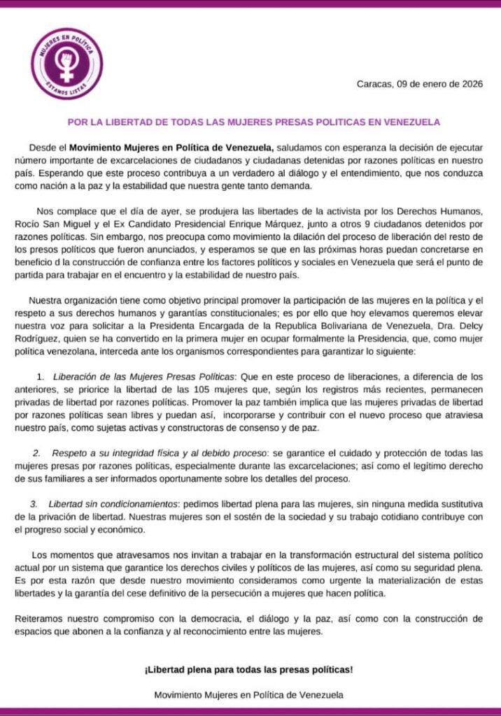 En el pronunciamiento, el Movimiento Mujeres en Política hizo un llamado directo a la Presidenta Encargada de la República Bolivariana de Venezuela, Delcy Rodríguez, a quien instaron a interceder ante los organismos correspondientes para garantizar que las excarcelaciones se materialicen, con especial énfasis en las mujeres detenidas. La organización destacó el valor simbólico e histórico de que sea una mujer quien ocupe formalmente la Presidencia, subrayando la responsabilidad de velar por los derechos humanos y las garantías constitucionales de otras mujeres.