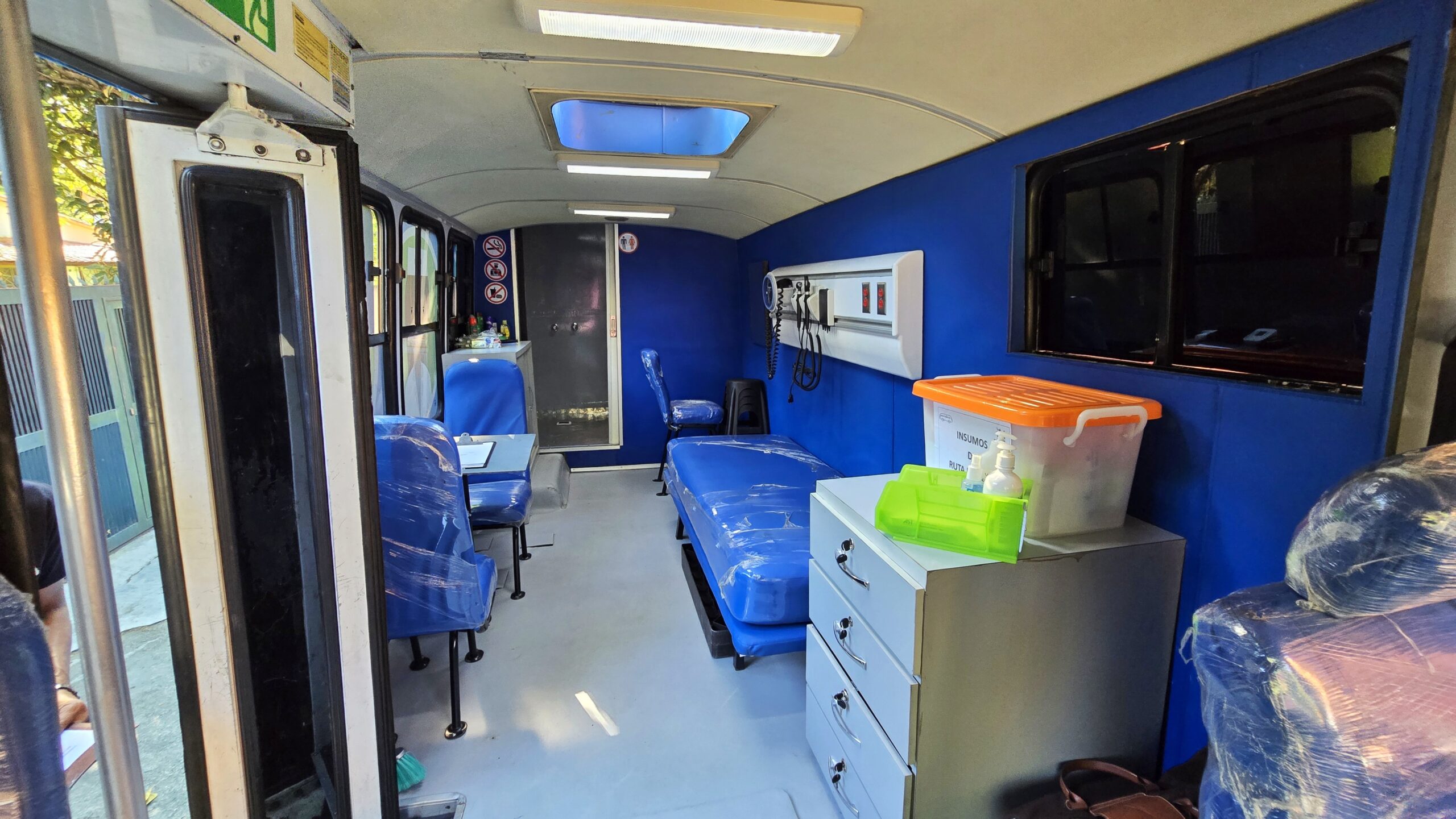 Subir al Panabus es cruzar un umbral de civilización. Afuera está el ruido, la hostilidad, el rechazo. Dentro, el aire cambia. Huele a limpio, a antiséptico, pero también a comida caliente y, sobre todo, a respeto. Hay un baño, una silla de peluquería y una camilla médica.